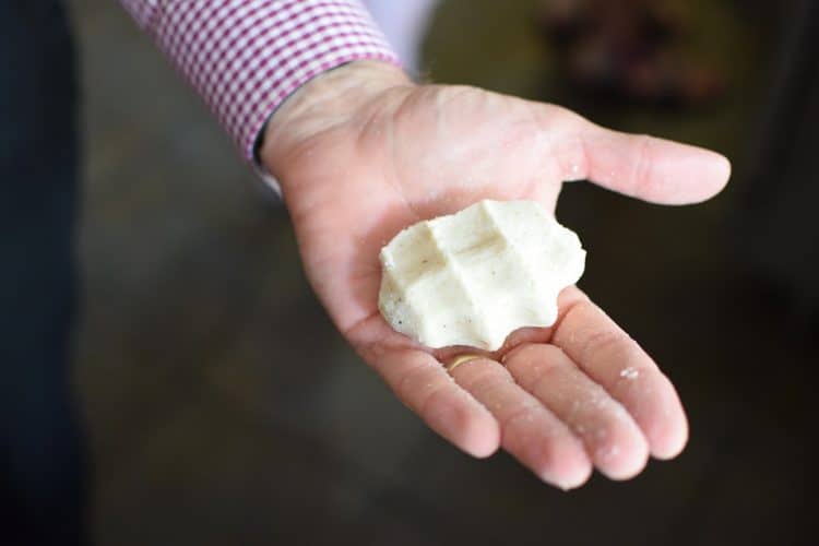 While the skillet is heating, mix the sieved cornmeal with warm water in a large bowl. Knead it a very long time until it becomes a smooth ball. You’ll know if you’ve added too little water if the mass is shaggy, and if there’s too much water, the ball won’t come together and will come apart in little pieces. It’s hard to specify how the dough should feel, as this is cornmeal (which varies greatly depending on the corn itself, how it’s ground, how long it’s been stored, and so on). The dough shouldn’t be wet, that’s for sure… it’s like the consistency of clay that you’ve prepared for making pottery. Like in so many things, experience is your best guide…